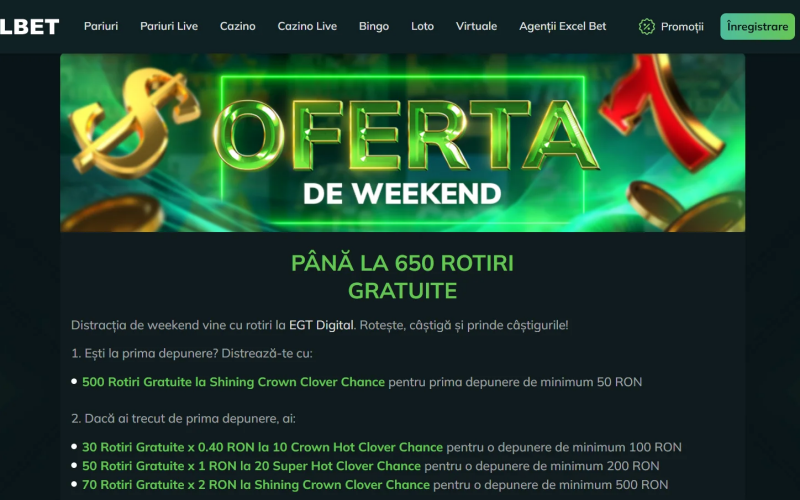 Oferta de promoții pentru Excelbet bonus este orientată atât către jucătorii noi, cât și către cei existenți. De obicei, veți găsi pachete de bun venit, rotiri gratuite pe sloturi specifice și promoții ocazionale legate de evenimente speciale sau jocuri noi. Promoții săptămânale, cashback sau turnee cu premii în bani și bonusuri pot fi disponibile pentru clienții activi. Este esențial să vizitați în mod regulat secțiunea de promoții și să examinați termenii și condițiile fiecărei oferte, astfel încât să știți exact cum este calculat rulajul și ce jocuri sunt incluse.